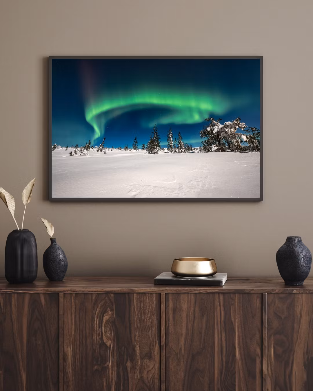 Denna poster visar ett vackert norrsken som sveper över ett orört, snötäckt landskap under en klar, stjärnprydd himmel. De gröna ljusbågarna dansar i kontrast mot den blå natten och de mjukt böljande snödrivorna, vilket skapar en lugn men kraftfull känsla. Det är ett motiv som för tankarna till tystnad, stillhet och naturens storslagna skönhet. Perfekt för dig som vill ha ett harmoniskt och inspirerande inslag i ditt hem. En poster som andas nordiskt lugn och vinterns magi.