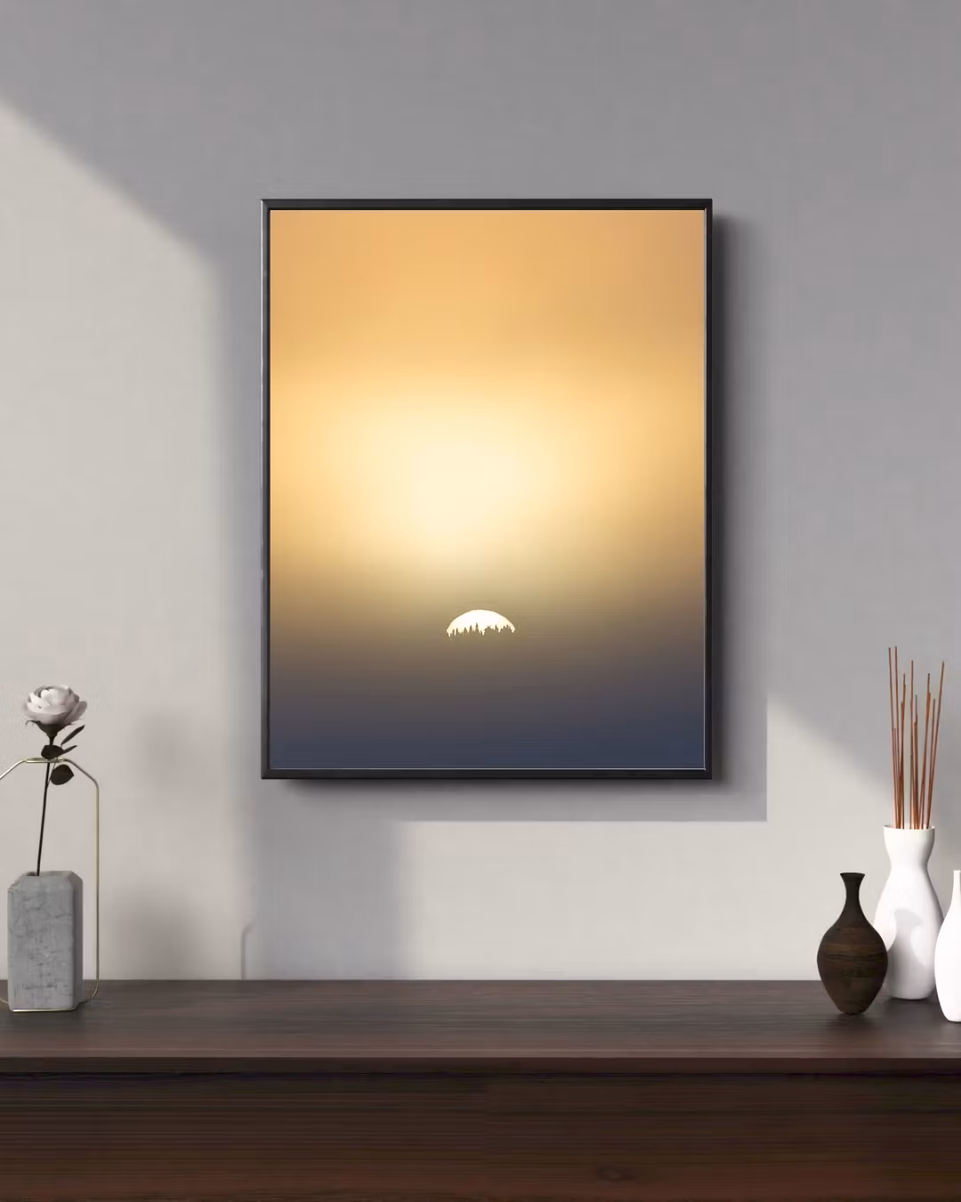 Denna poster fångar ett unikt ögonblick där solen just stiger upp (eller sjunker ner) bakom skogslinjen, inbäddad i ett gyllene dis som övergår i blått. Den minimalistiska kompositionen och det subtila ljuset skapar ett nästan andligt lugn – en bild som viskar snarare än ropar. Ett motiv för dig som uppskattar stillhet, balans och nordiskt ljus i sin mest avskalade form. Perfekt för sovrum, meditationsrum eller alla miljöer där harmoni och tyst skönhet är i fokus. En poster som fångar det första (eller sista) andetaget av dagen.